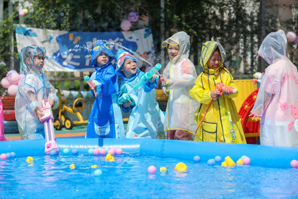 5月29日,在浙江省湖州市吴兴区埭溪镇中心幼儿园举行的迎“六一”主题活动上,小朋友在进行“水枪大作战”。