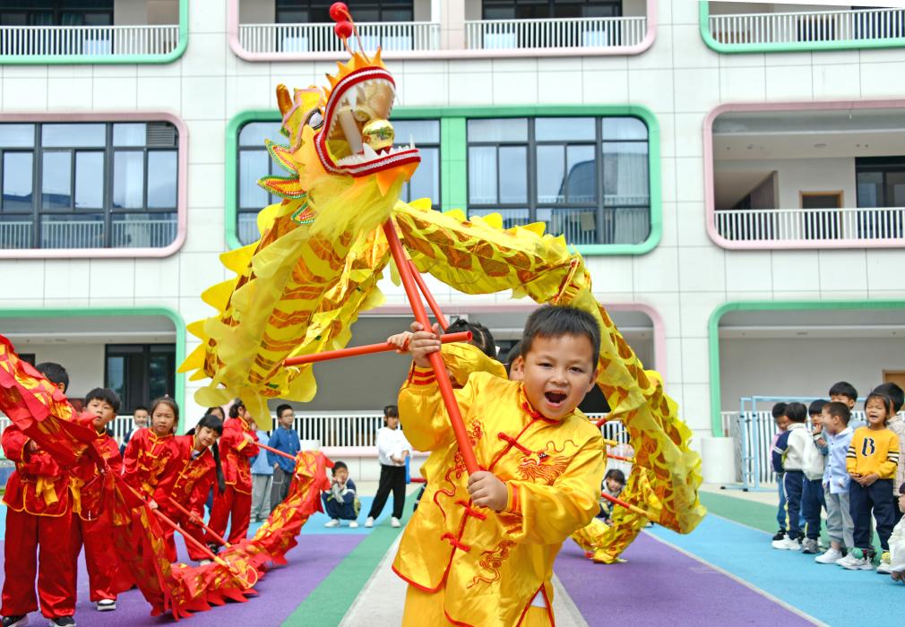 5月29日,浙江省台州市仙居县迎晖幼儿园的孩子们在舞龙。