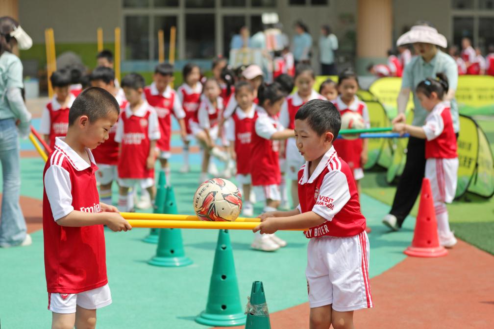 5月29日,安徽省淮北市第二实验幼儿园的小朋友在进行趣味足球游戏。
