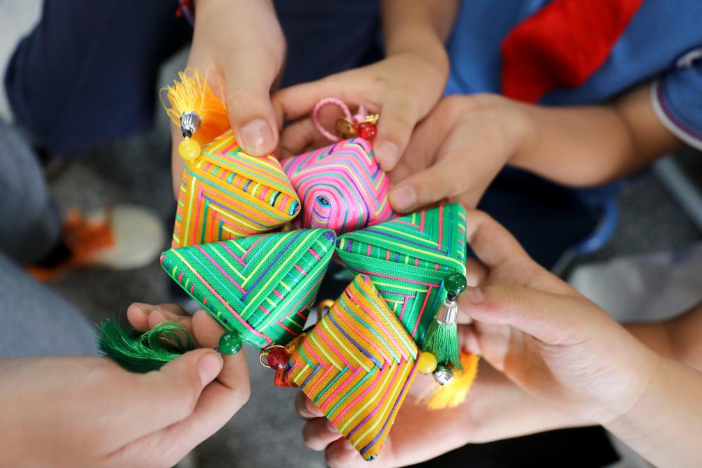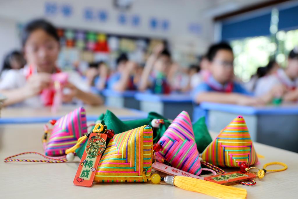 ↑2025年5月26日,浙江省杭州市桐庐县迎春小学的孩子们在展示香囊。CICPHOTO/徐军勇 摄