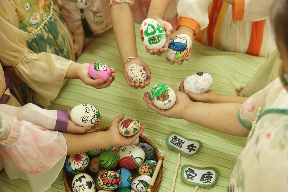 ↑2025年5月27日,浙江省湖州市德清县乾元镇第一幼儿园,孩子们在展示彩蛋。CICPHOTO/倪立芳 摄