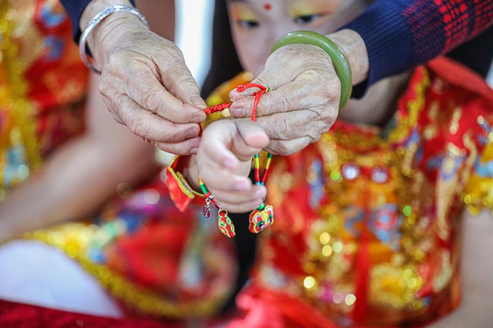 ↑2025年5月27日,在广西桂林市灵川县定江镇,老人在给小朋友佩戴五彩手绳。CICPHOTO/阳海翔 摄 编辑:刘潋