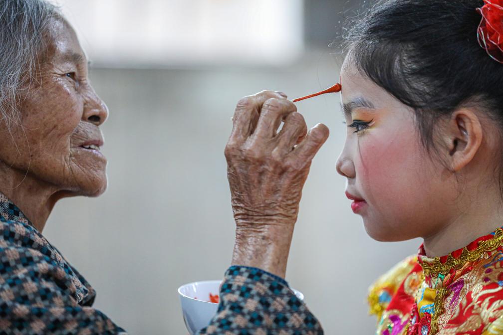 ↑2025年5月27日,在广西桂林市灵川县定江镇,老人在给小朋友点雄黄。CICPHOTO/阳海翔 摄