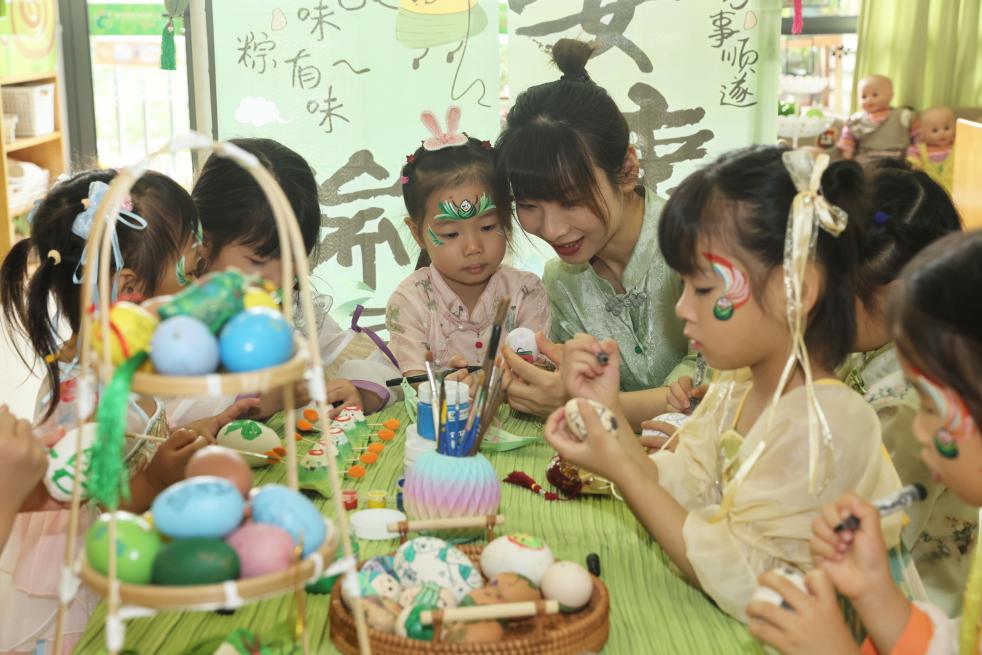 ↑2025年5月27日,浙江省湖州市德清县乾元镇第一幼儿园,孩子们在制作彩蛋。CICPHOTO/倪立芳 摄