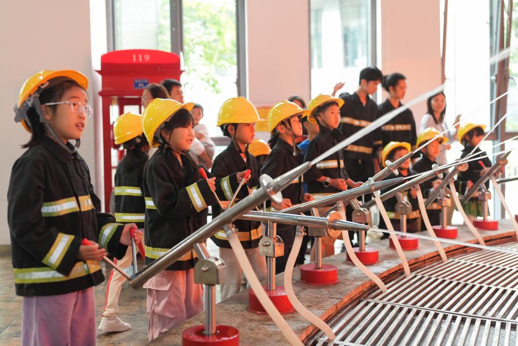 6月2日,小朋友在杭州青少年活动中心“Do都城”体验“消防员”灭火救援。