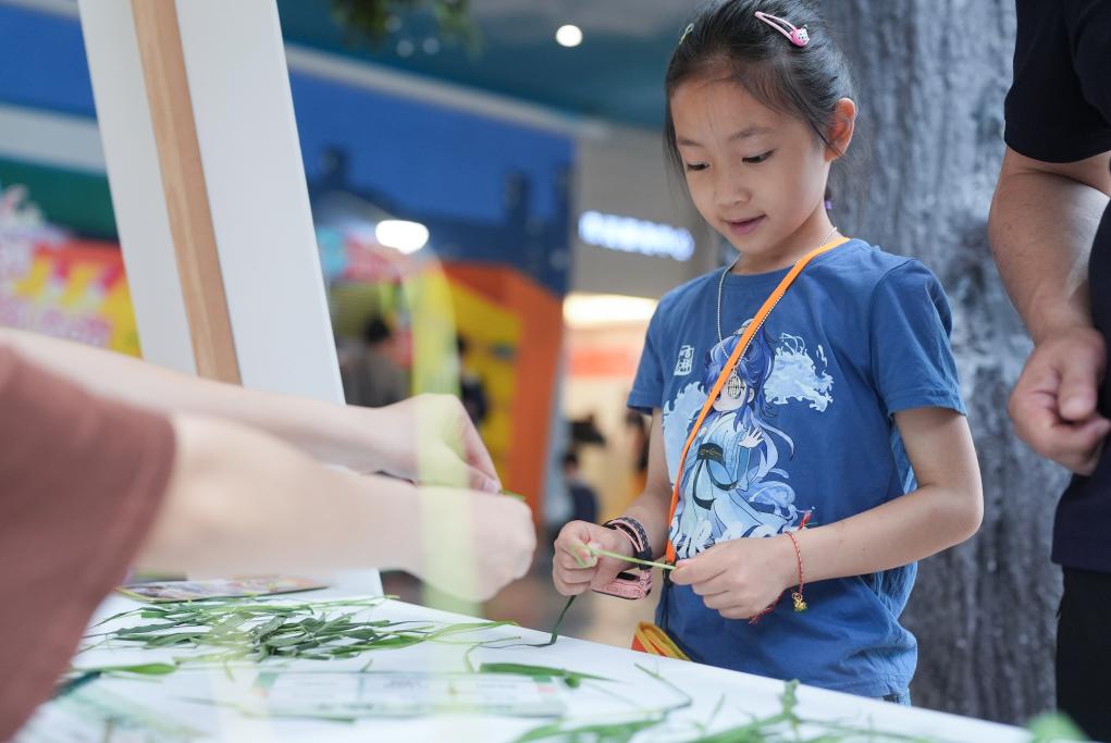 6月2日,小朋友在杭州青少年活动中心“Do都城”的端午主题活动中体验“斗草”传统游戏。