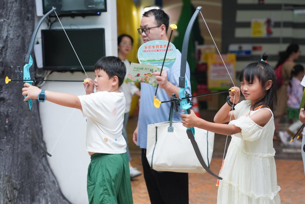 6月2日,小朋友在杭州青少年活动中心“Do都城”的端午主题活动中体验“射五毒”传统游戏。