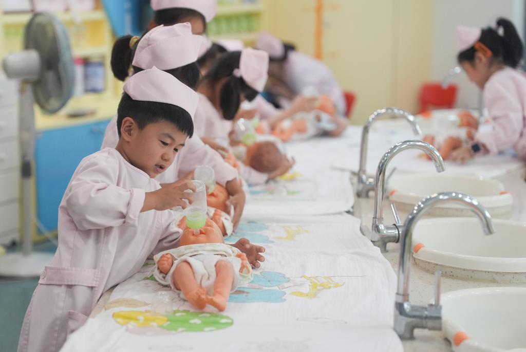 6月2日,小朋友在杭州青少年活动中心“Do都城”体验“新生儿护理”。