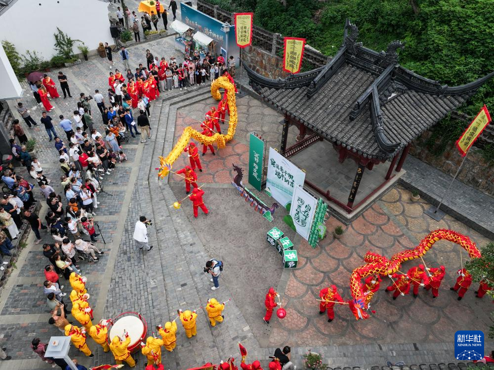 5月31日,游客在江苏宜兴前墅龙窑旁的广场观看舞龙表演。