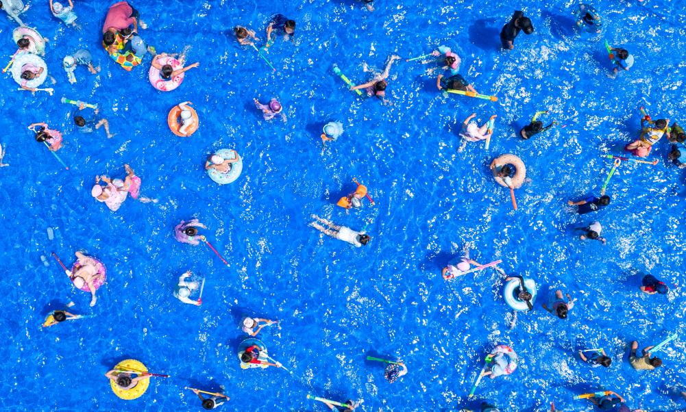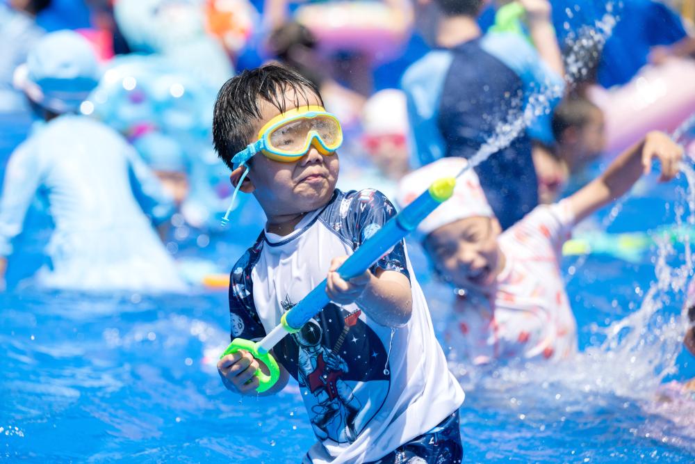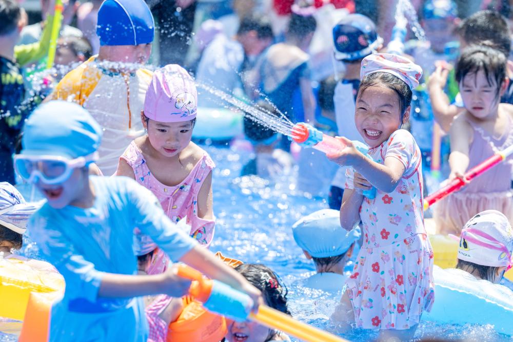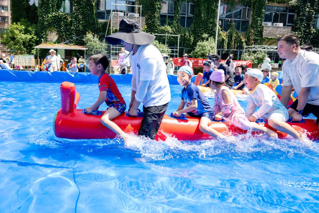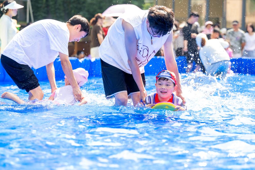 近日,在浙江省湖州市长兴县一幼儿园内,孩子与家长共同参加趣味水上运动,在清凉嬉戏中锻炼身体,增进亲子感情。