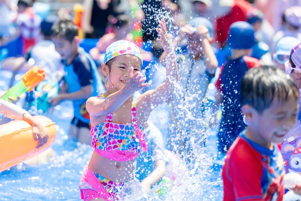 ↑2025年6月18日,在浙江省湖州市长兴县一幼儿园内,孩子们在参加趣味水上运动项目。CICPHOTO/谭云俸 摄