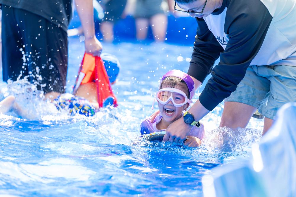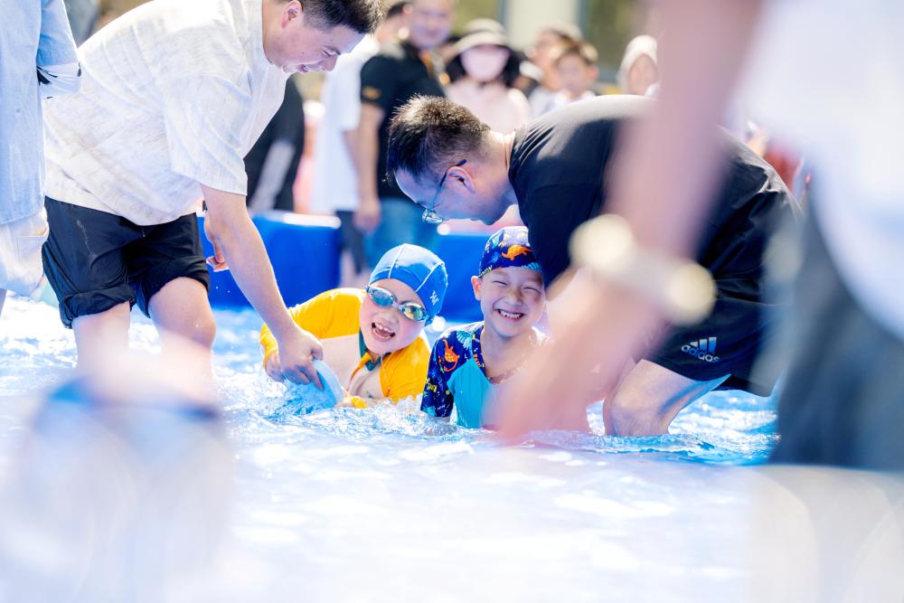 ↑2025年6月18日,在浙江省湖州市长兴县一幼儿园内,孩子与家长共同参加趣味水上运动项目。CICPHOTO/谭云俸 摄