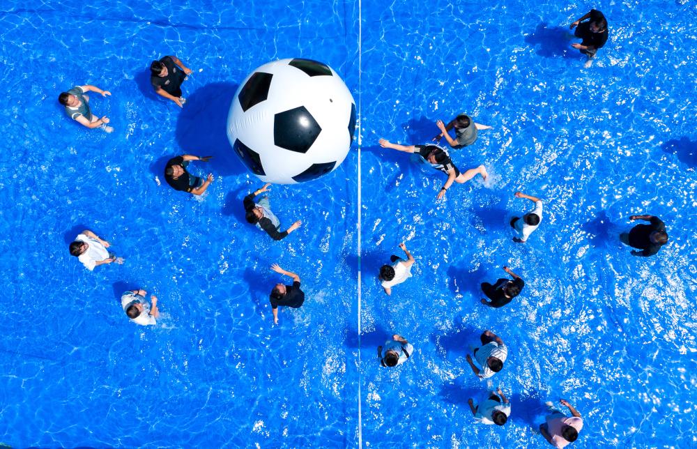 ↑2025年6月18日,在浙江省湖州市长兴县一幼儿园内,孩子们在参加趣味水上运动项目。(无人机照片)CICPHOTO/谭云俸 摄