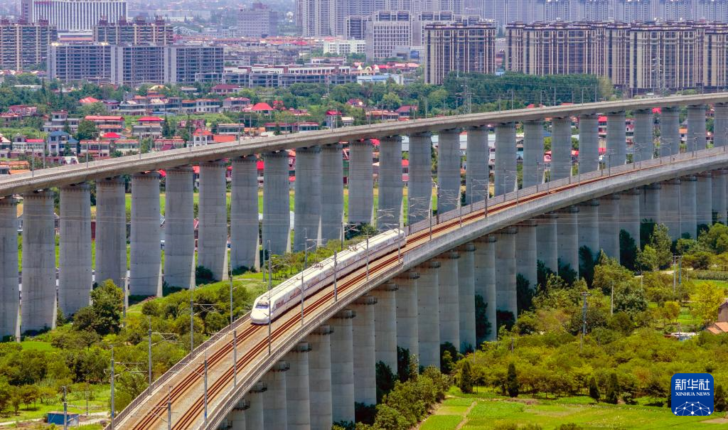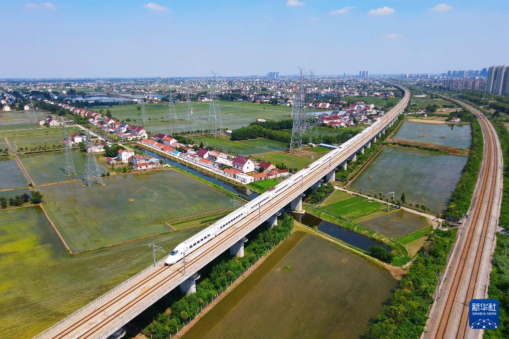 7月1日,列车行驶在江苏省如皋市境内(无人机照片)。