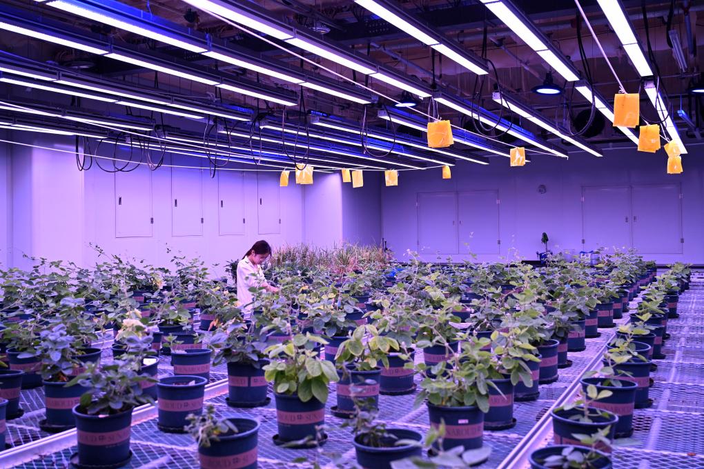 7月6日,研究人员在黄淮海(宿州)种业科技谷南京农业大学大豆生物育种中心人工气候室观察育种材料生长情况。