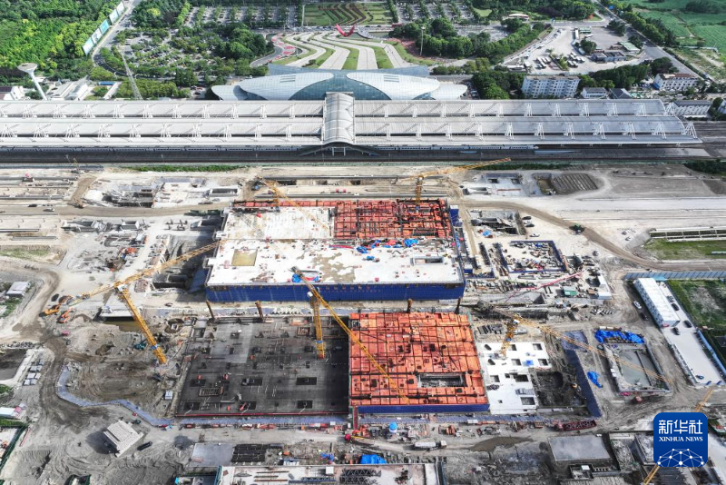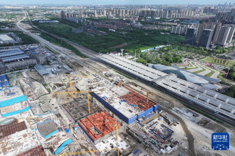 7月21日拍摄的新建上海至南京至合肥高速铁路南通站站房施工现场(无人机照片)。