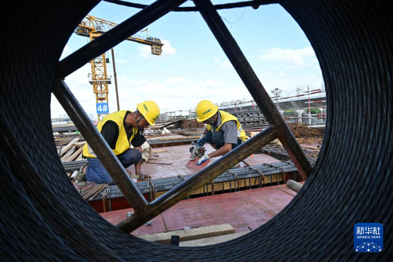 7月21日,中铁建工工人在施工现场绑扎钢筋。