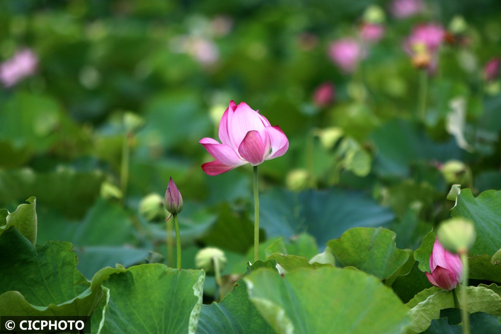 ↑2025年7月26日,浙江省舟山市普陀田园综合体的荷花竞相开放。CICPHOTO/胡社友 摄