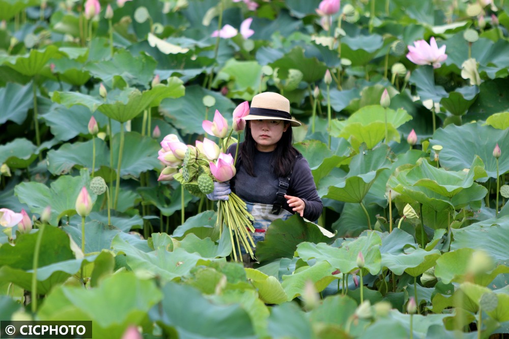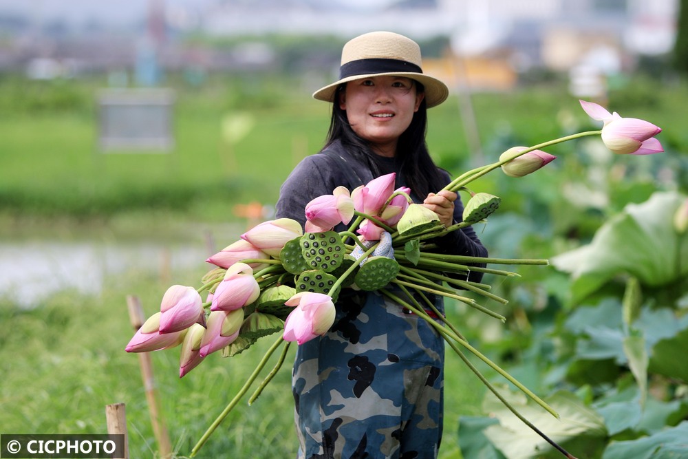 ↑2025年7月26日,浙江省舟山市普陀田园综合体的管理人员在采摘荷花、莲蓬,供应给游客。CICPHOTO/胡社友 摄