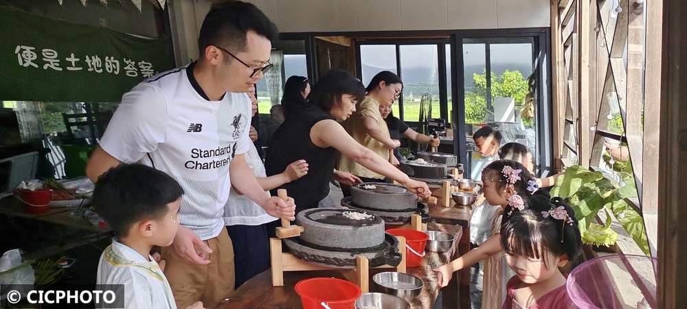 ↑2025年7月26日,游客在浙江省舟山市普陀田园综合体农庄体验磨藕粉。CICPHOTO/胡社友 摄