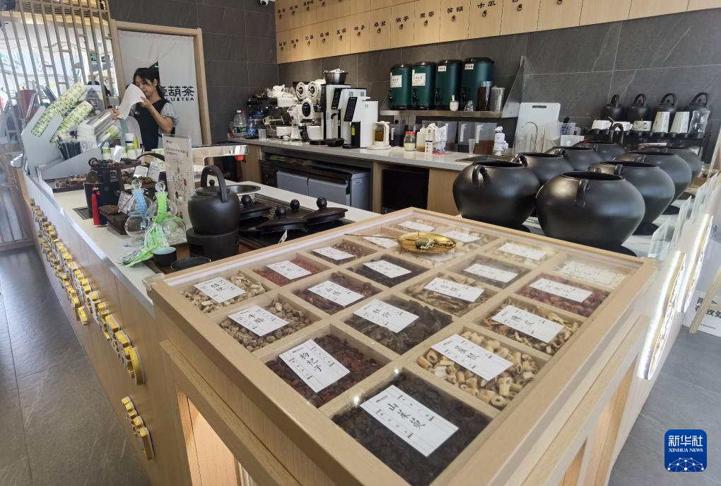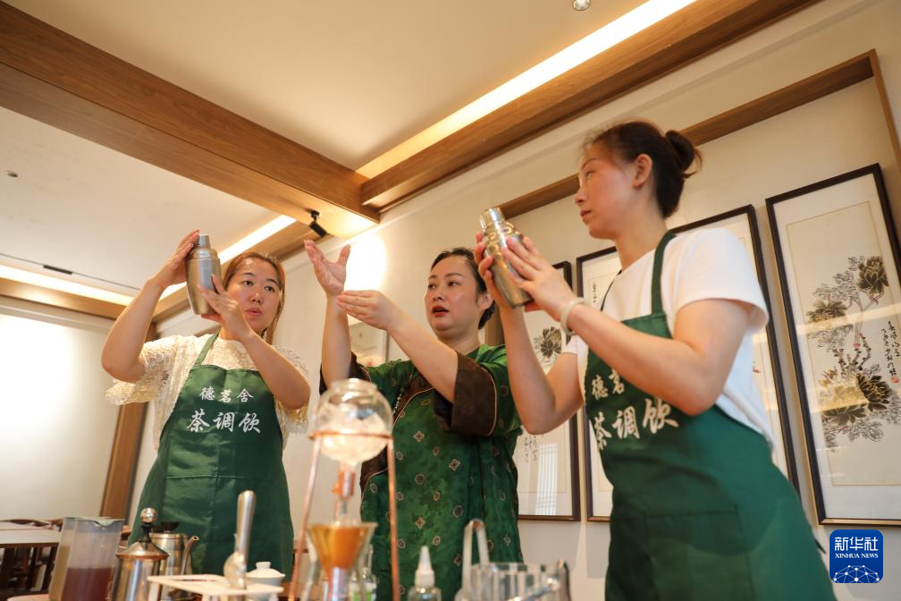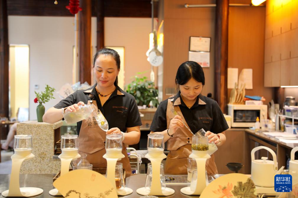 7月15日,在黄山市屯溪区一处茶空间,店员制作新中式茶饮。