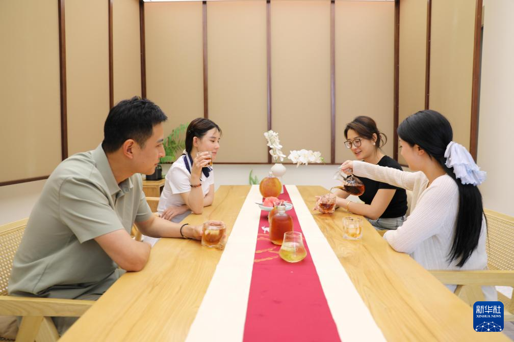 7月15日,在黄山市屯溪区一处茶空间,游客在体验新中式茶饮。