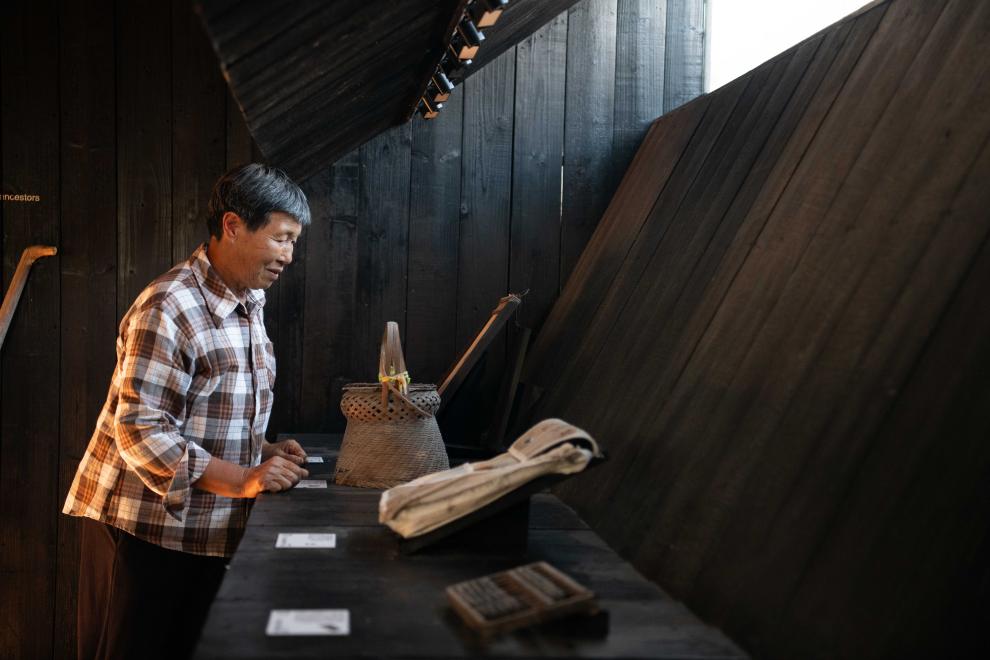 7月24日,在安徽省黄山市黟县丰梧村“乡村记忆博物馆”内,村民朱灶莲观看展出的老物件。新华社记者 张端 摄