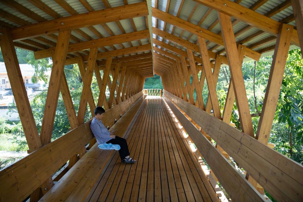 7月24日,在安徽省黄山市黟县丰梧村,村民在水渠廊桥附近休闲。新华社记者 张端 摄穿过廊桥