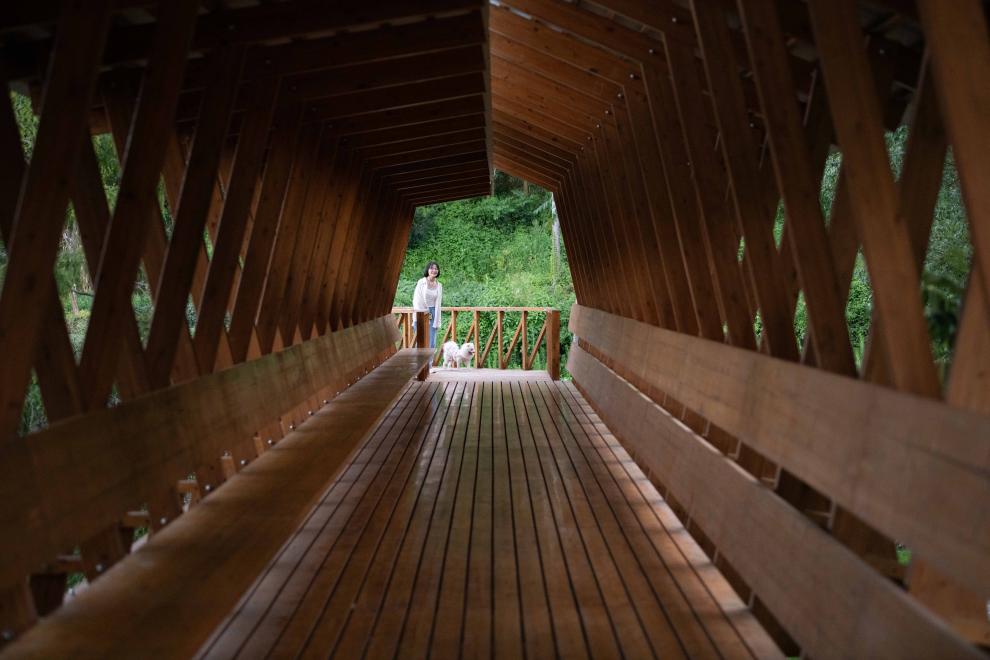 7月24日,在安徽省黄山市黟县丰梧村,一名游客走在水渠廊桥上。新华社记者 张端 摄