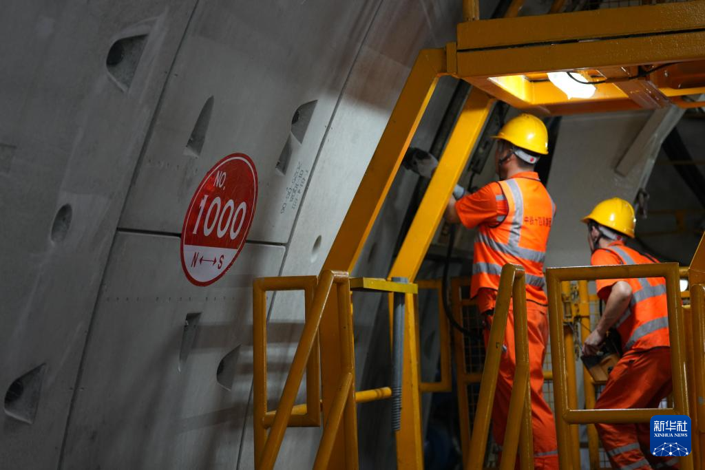 8月1日,中铁十四局技术人员在钱塘江隧道“钱塘号”盾构机内进行管片拼装作业。