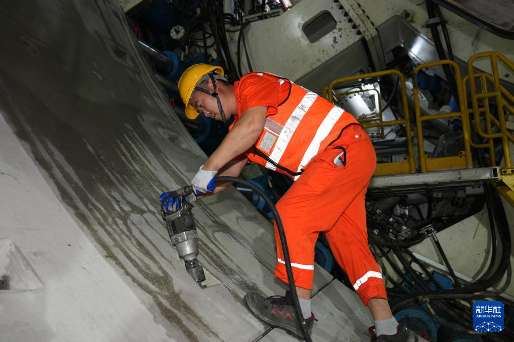 8月1日,中铁十四局技术人员在钱塘江隧道“钱塘号”盾构机内操作箱涵拼装设备。