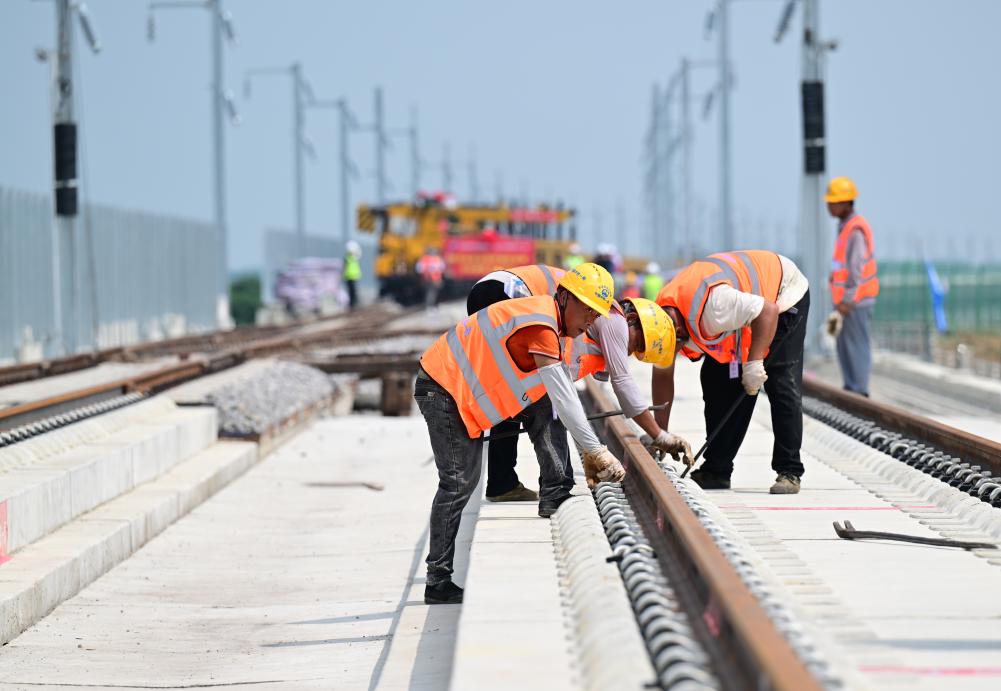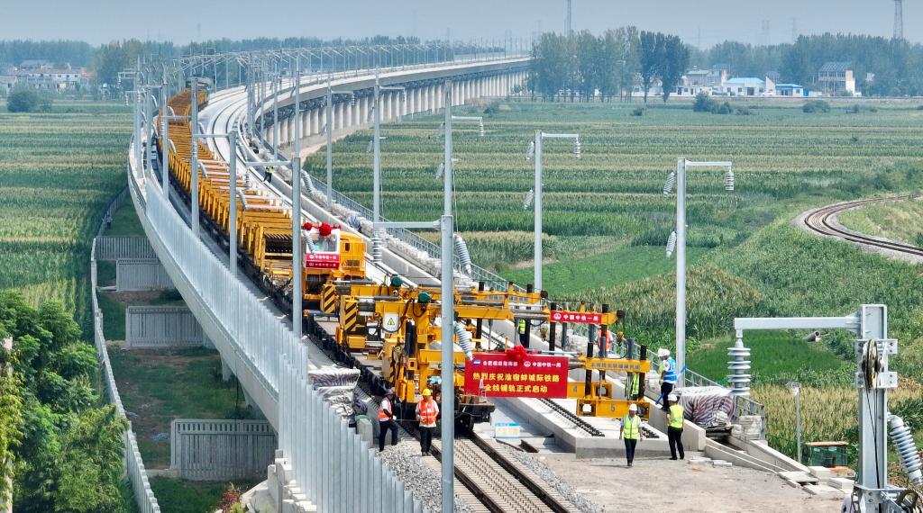 8月6日,中铁一局施工人员在淮宿蚌城际铁路铺轨施工现场作业。