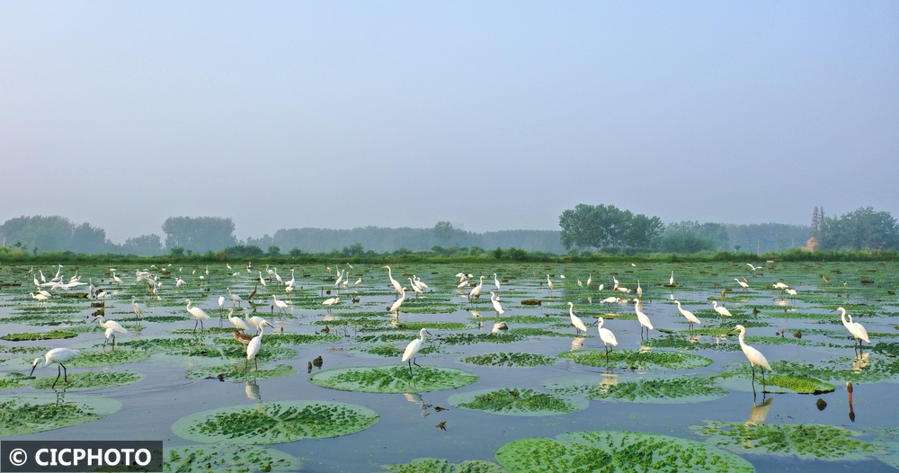 ↑2025年8月6日,一群白鹭在江苏省淮安市洪泽区东双沟镇一处芡实塘里觅食。(无人机照片)CICPHOTO/刘彬 摄
