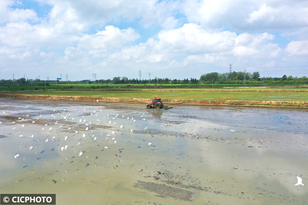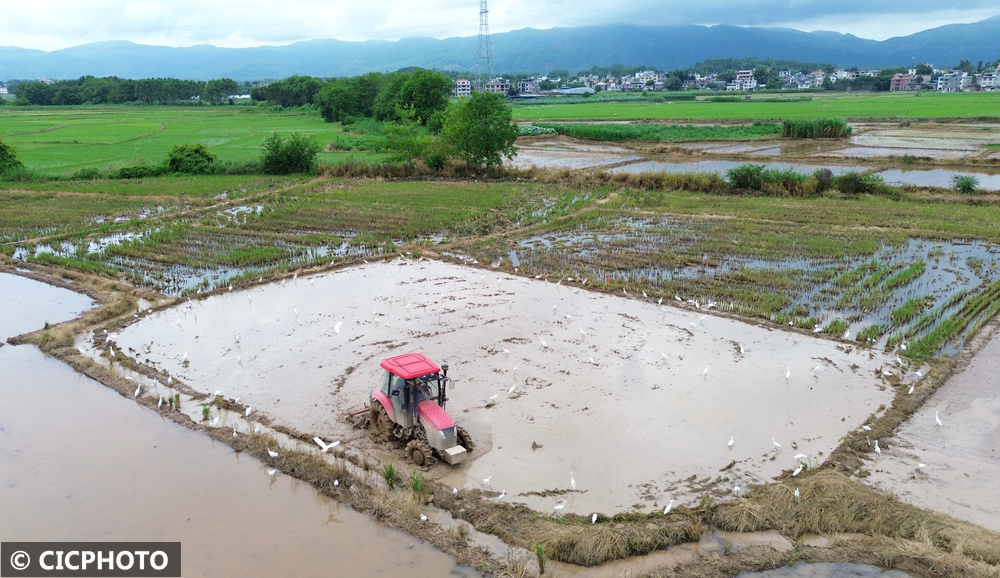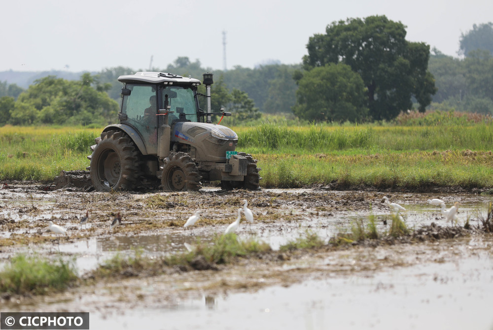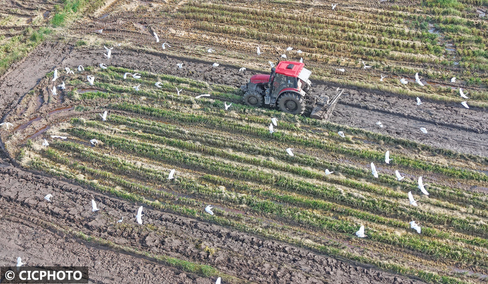 ↑2025年7月29日,湖南省永州市道县寿雁镇大洞村的农民驾驶农机翻耕稻田,一群鹭鸟在一旁觅食。CICPHOTO/何红福 摄