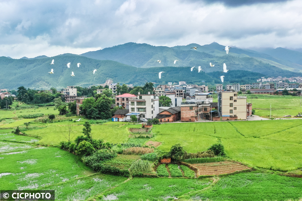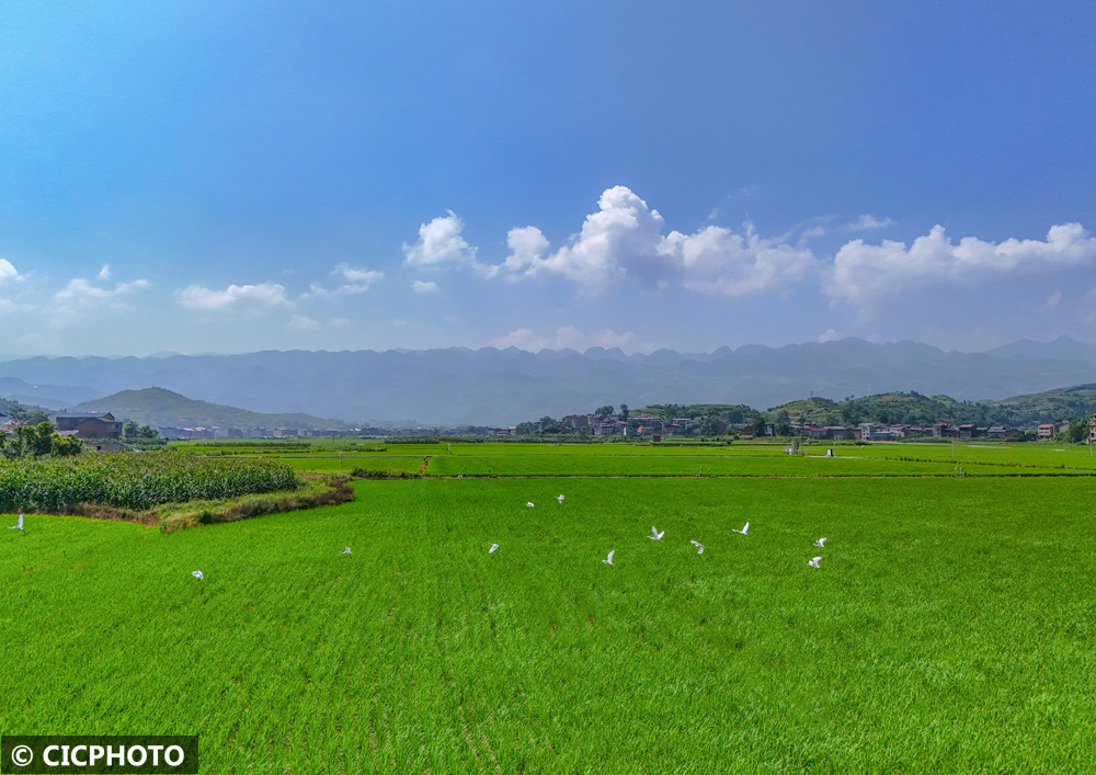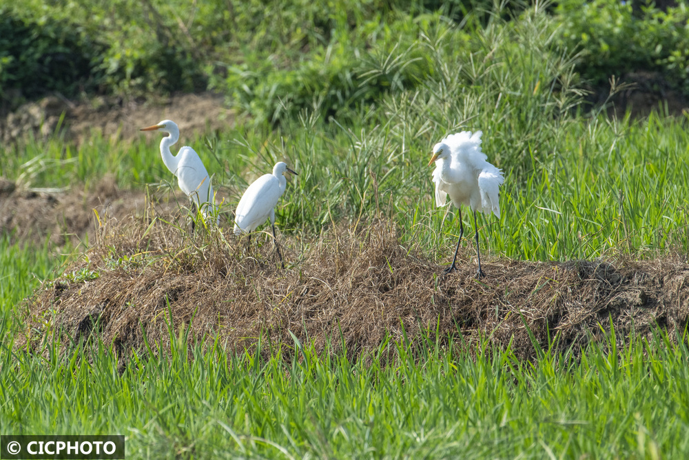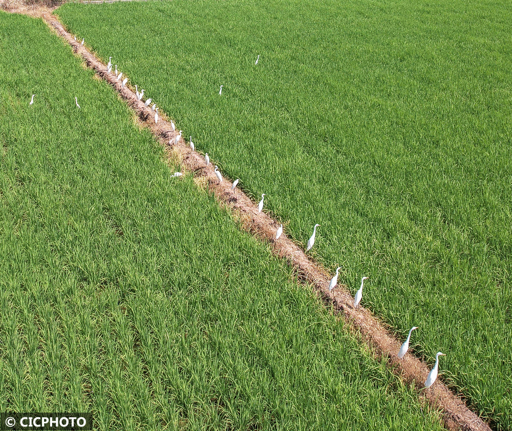 盛夏时节,白鹭、牛背鹭等鹭鸟在田间飞翔、栖息和觅食,呈现出一幅幅如画的生态美景。