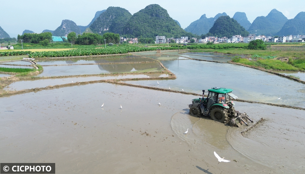 ↑2025年7月18日,广西贺州市平桂区鹅塘镇湴田村的农民驾驶农机翻耕水田,一群鹭鸟在一旁飞翔、觅食。(无人机照片)CICPHOTO/廖祖平 摄