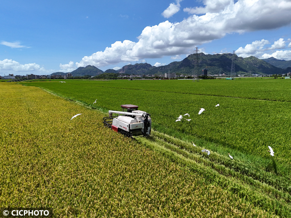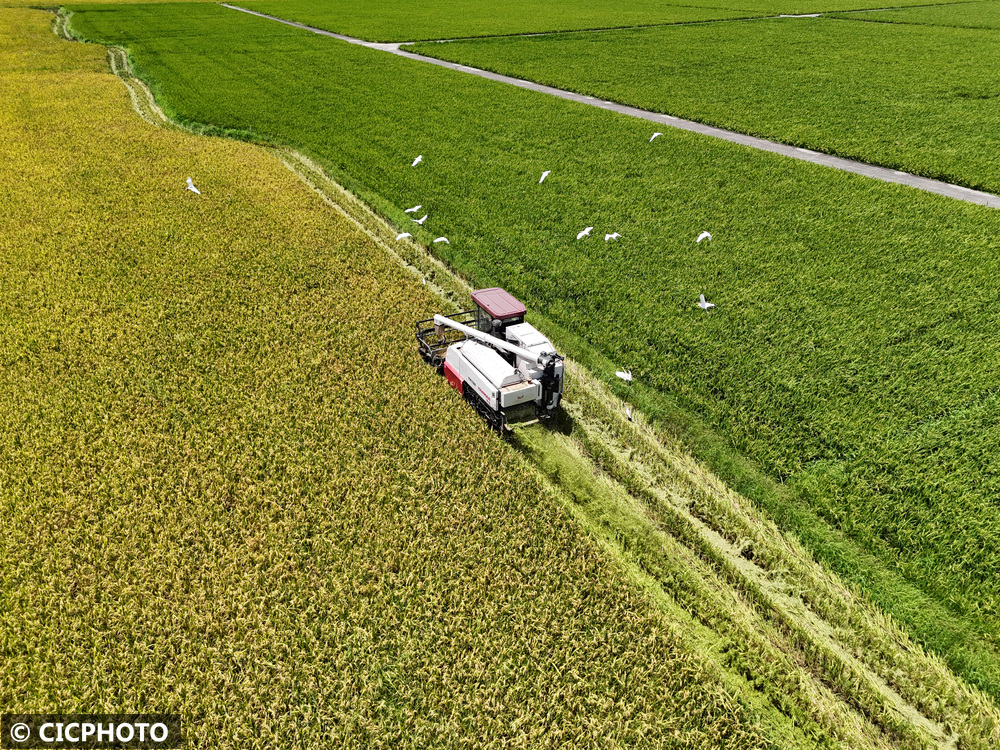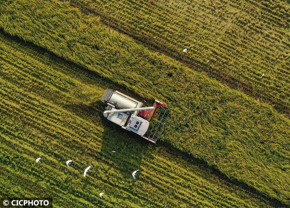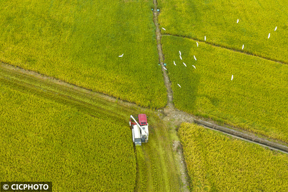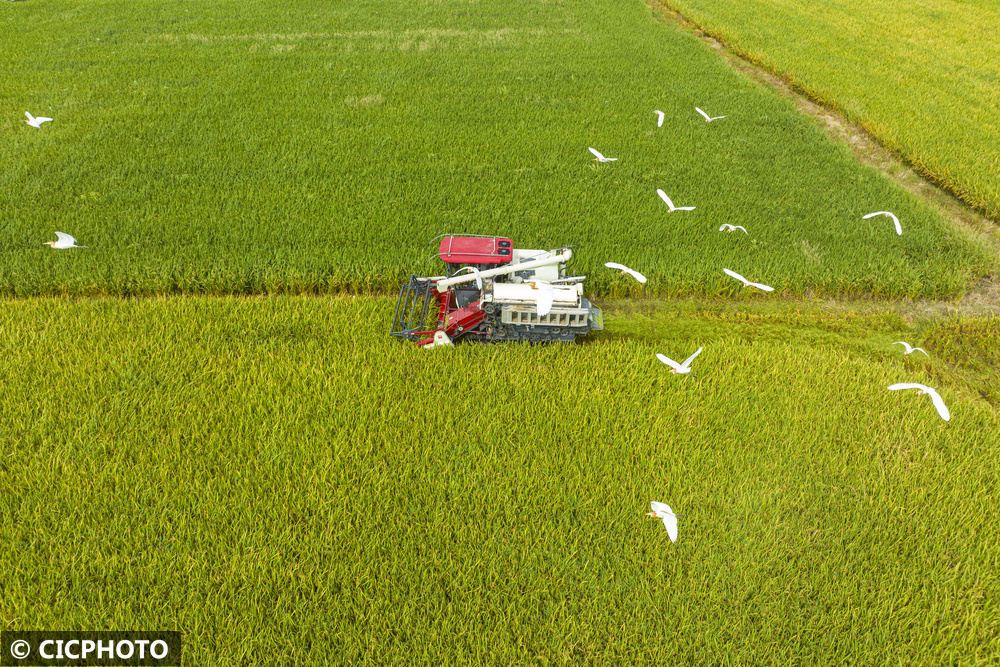 ↑2025年7月6日,农机手驾驶农机在浙江省乐清市石帆街道河淇村稻田里作业,一群鹭鸟在一旁飞翔、觅食。(无人机照片)CICPHOTO/蔡宽元 摄