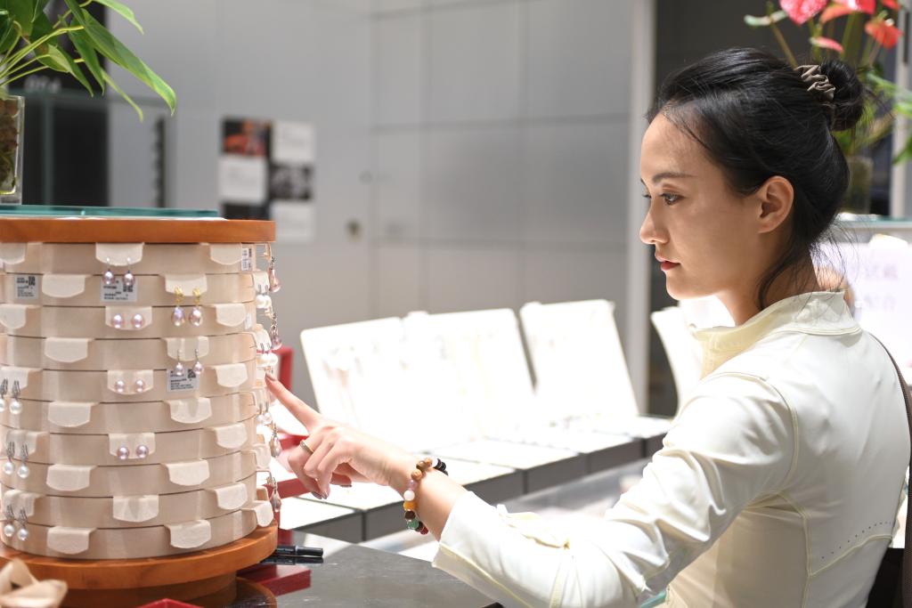 8月9日,一名顾客在浙江省诸暨市山下湖镇的华东国际珠宝城选购珍珠耳饰。