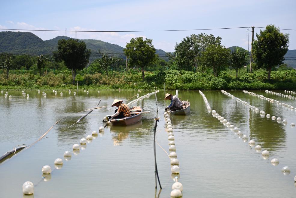 8月9日,工作人员在浙江省诸暨市山下湖镇的珍珠智能化养殖基地放蚌。