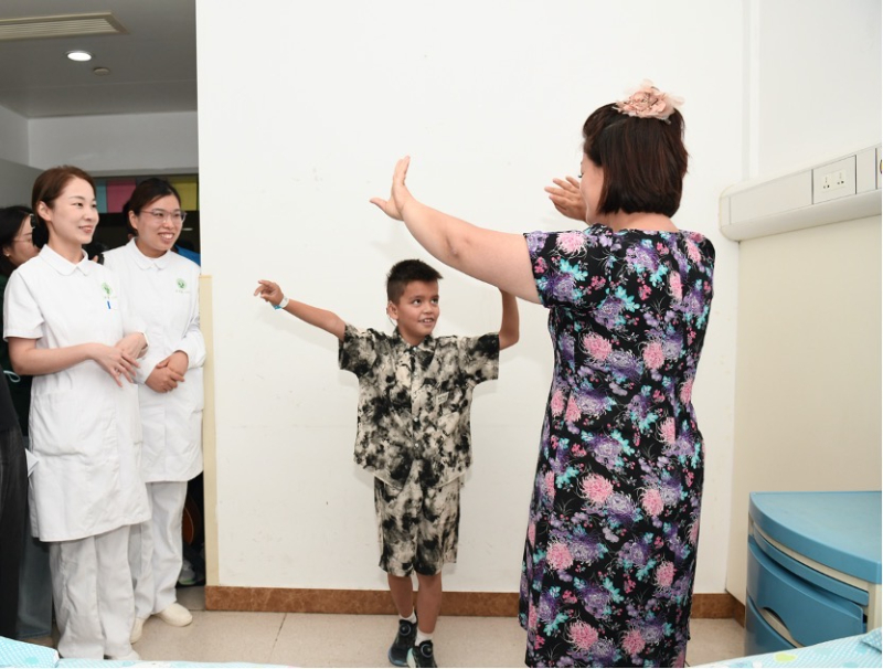 8月11日上午,在东南大学附属中大医院烧伤整形科的病房里,新疆小耳症男孩伊力亚斯和他的妈妈古丽一起跳起新疆舞,庆祝伊力亚斯成功完成小耳再造一期手术。